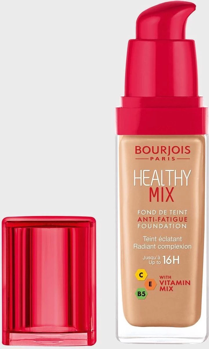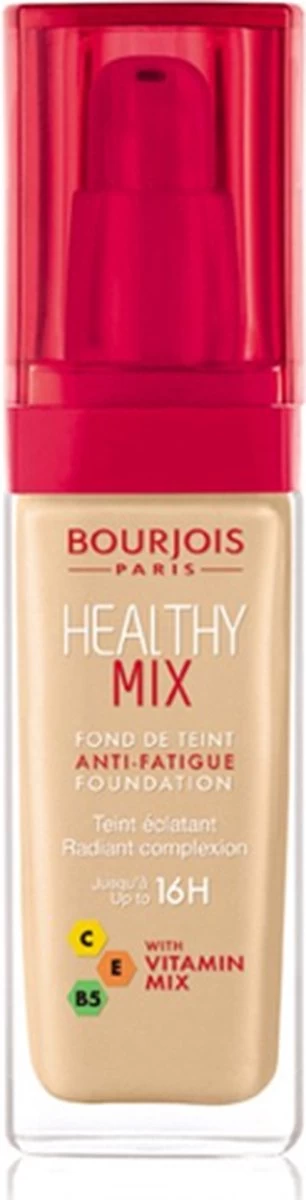 Ben je het zat om er vermoeid uit te zien? De Bourjois Healthy Mix Anti-Fatigue Foundation geeft je een gezonde, natuurlijke glans die jouw huid weer laat stralen. Met de mix van vitamine C, E en B5 verbergt het direct onvolkomenheden en tekenen van vermoeidheid en versterkt het de glans van de huid voor een fris uitziende blik. Je huid is 16 uur lang 70% stralender en blijft tot 24 uur gehydrateerd. De smeltende textuur met hyaluronzuur mengt perfect met de huid en blijft de hele dag comfortabel aanvoelen. Voor een medium dekking en semi-matte afwerking direct na het aanbrengen. Healthy Mix Anti-Fatigue make up foundation van Bourjois is je nieuwe geheime wapen om er altijd fris en stralend uit te zien! Als Parijs merk is Bourjois geïnspireerd door de “je ne sais quoi” waarvoor de Parisiennes zo bekend om staan. Speel met kleur en voeg wat speelsheid toe aan je stijl. Wij schenken elke vrouw het Parijse geheim van moeiteloze maar chique schoonheid.