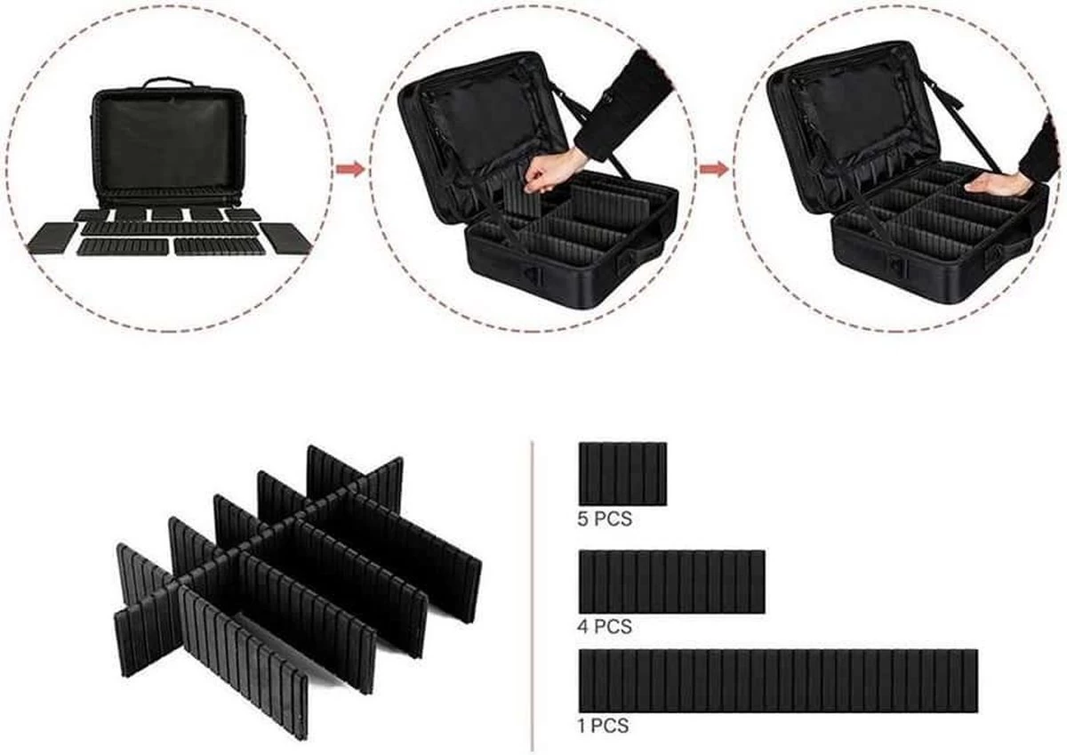 Deze multifunctionele opbergtas voor onder andere make-up, nagel accessoires of kappers benodigdheden heeft veel verschillende opbergmogelijkheden. De opbergtas bestaat uit verstelbare vakken. Verder is de tas stevig en praktisch en kan je hierdoor ook al je materialen en accessoires erin vervoeren. De opbergtas kan dan ook op meerdere manieren worden gedragen. De schouderband kan namelijk op verschillende manieren aan de tas worden bevestigd.