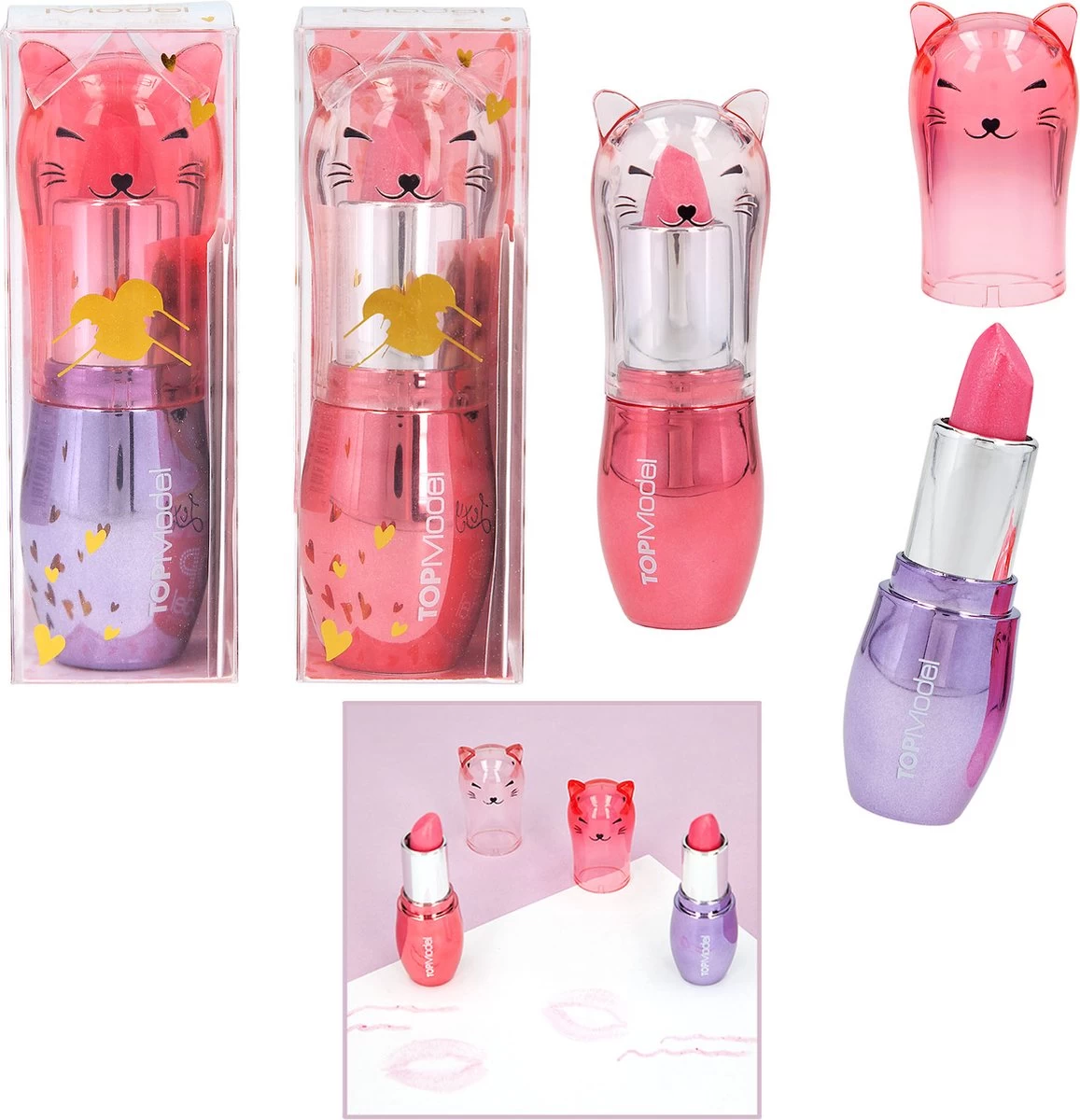 Super schattige lippenstiften van TOPModel met kattenoren! De lippenstiften zijn licht dekkend, hebben mooie roze tonen en met geweldige luchtjes: de roze lippenstift ruikt naar milkshake, de rosé lippenstift naar appel. Elk verpakt in een transparant doosje. Inhoud: elk 3 g.
