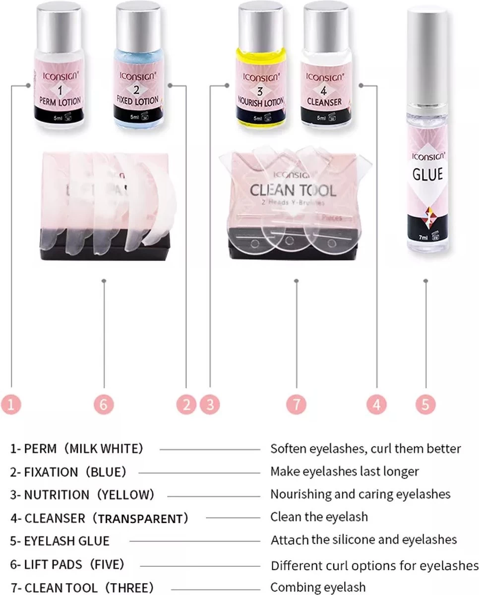 Stappen 1. Gebruik een reinigingsmiddel om de olie, stof en make-up resten te verwijderen. 2. Breng daarnaast de oogbeschermers aan, onder de oogleden om je huid te beschermen tegen de permanente lotion 3. Vervolgens plaatst u de liftpads op de wimper en brengt de lijm aan op de wimper om deze vervolgens op de pads te laten kleven. 4. Daarna gebruik je een lijm en plaatst de wimper 1 minuut op de liftpads. 5. Daarnaast gebruik je de #1 lotion op de wimper en bedek de plastic pads ruim 8-12 minuten 6. Vervolgens de fixatiemiddel #. 2 op de wimper en bedek deze plastic pads ruim 8-12 minuten 7. Reinig de wimperlift kussentjes en gebruik daarna vervolgens de # 3 voedingslotion om wimpers te voeden. 8. Gebruik de nummer # 4reiniging om dus alle perm resten te vervolgens te verwijderen.