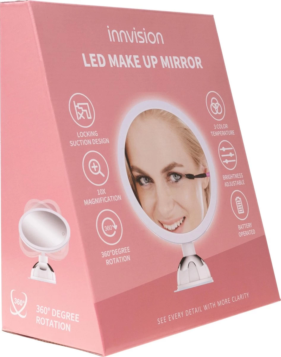 Met deze make-up spiegel met verlichting ben je ’s ochtends zo klaar. Door de 10x vergrotende functie zie je elk detail op je gezicht wat opmaken, epileren en scheren heel gemakkelijk maakt! Dit nieuwe model is in te stellen in 3 tinten verlichting en dus helemaal aan te passen aan jouw behoefte. De sterke zuignap maakt dat de make up/scheerspiegel geschikt is voor elk glad oppervlak. Met een simpele draaibeweging komt de vergrootspiegel ook zo weer los, waardoor hij ideaal is om mee te nemen op reis. Bovendien heb je altijd goede verlichting bij de hand!