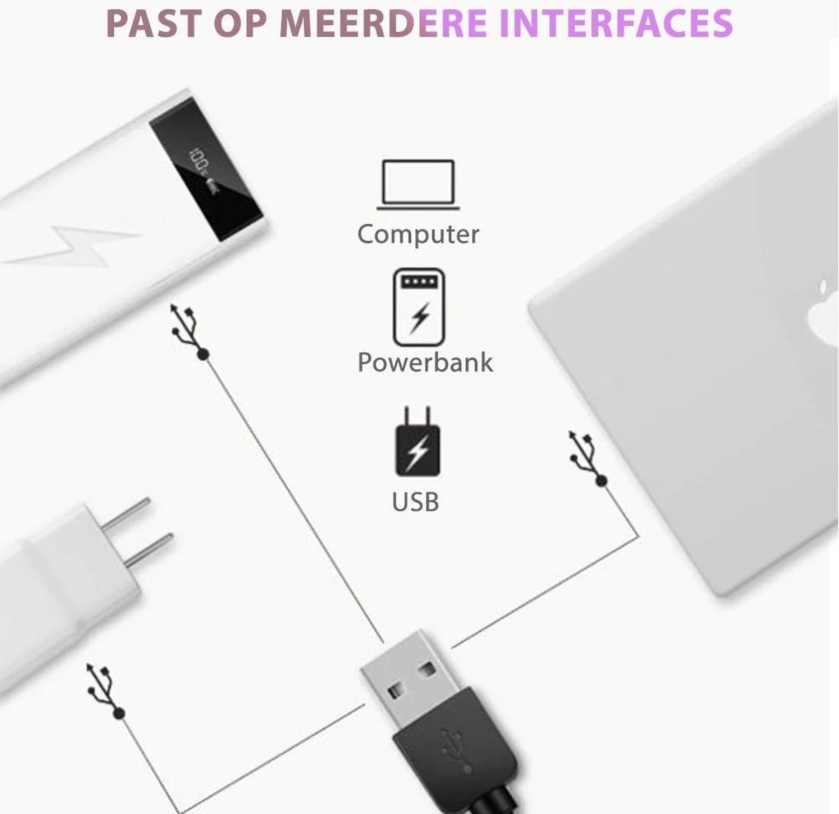– Oplaadbaar en aansluiting via USB: Stekker, computer en powerbank