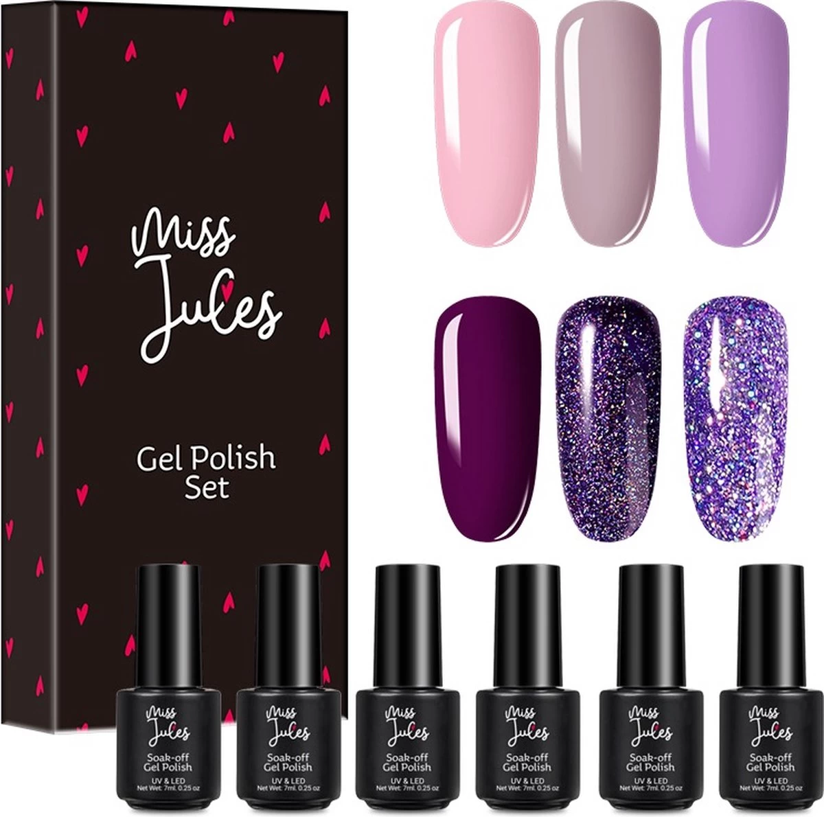 Met deze 6-delige gel nagellak set van Miss Jules heb je keuze uit 6 trendy kleuren voor elke gelegenheid. Deze gellak kan zowel op een natuurlijke nagel als op een kunstnagel worden aangebracht.