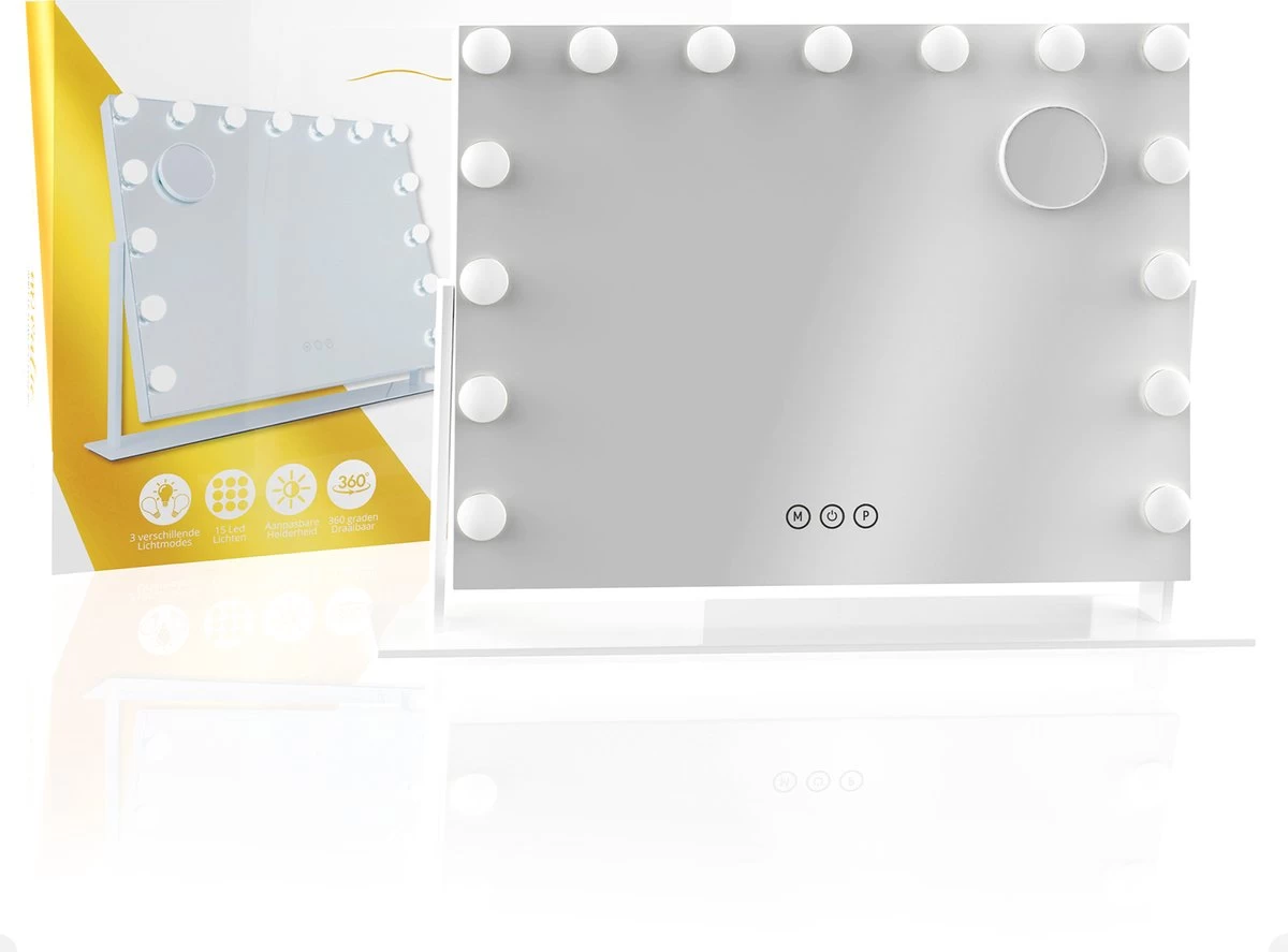 - 360 graden draaibaar: Heb je meerdere favoriete plekjes om jouw make-up te doen? Verblijf je elders dan thuis? Grote kans dat je niet een tafel hebt met exact dezelfde hoogte als je gewend bent. Dan heb je geen zin om met dikke boeken, onhandige onderzetters, of kromme constructies jouw Hollywood Mirror juist te zetten. Jij hebt geen zin in gedoe, wij begrijpen dat. Geniet van een 360 graden, draaibare spiegel.