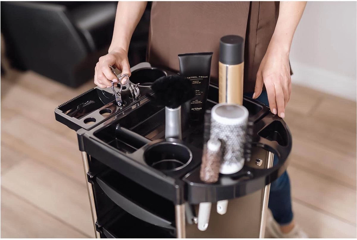 De opbergruimte bovenaan de trolley biedt een optimale oplossing dankzij de slimme indeling om de föhn, schaar en borstels direct bij de hand te plaatsen. De zijelementen kunnen indien nodig worden ingeklapt om ruimte te besparen. De laden kunnen ook gedeeltelijk of volledig worden verwijderd.