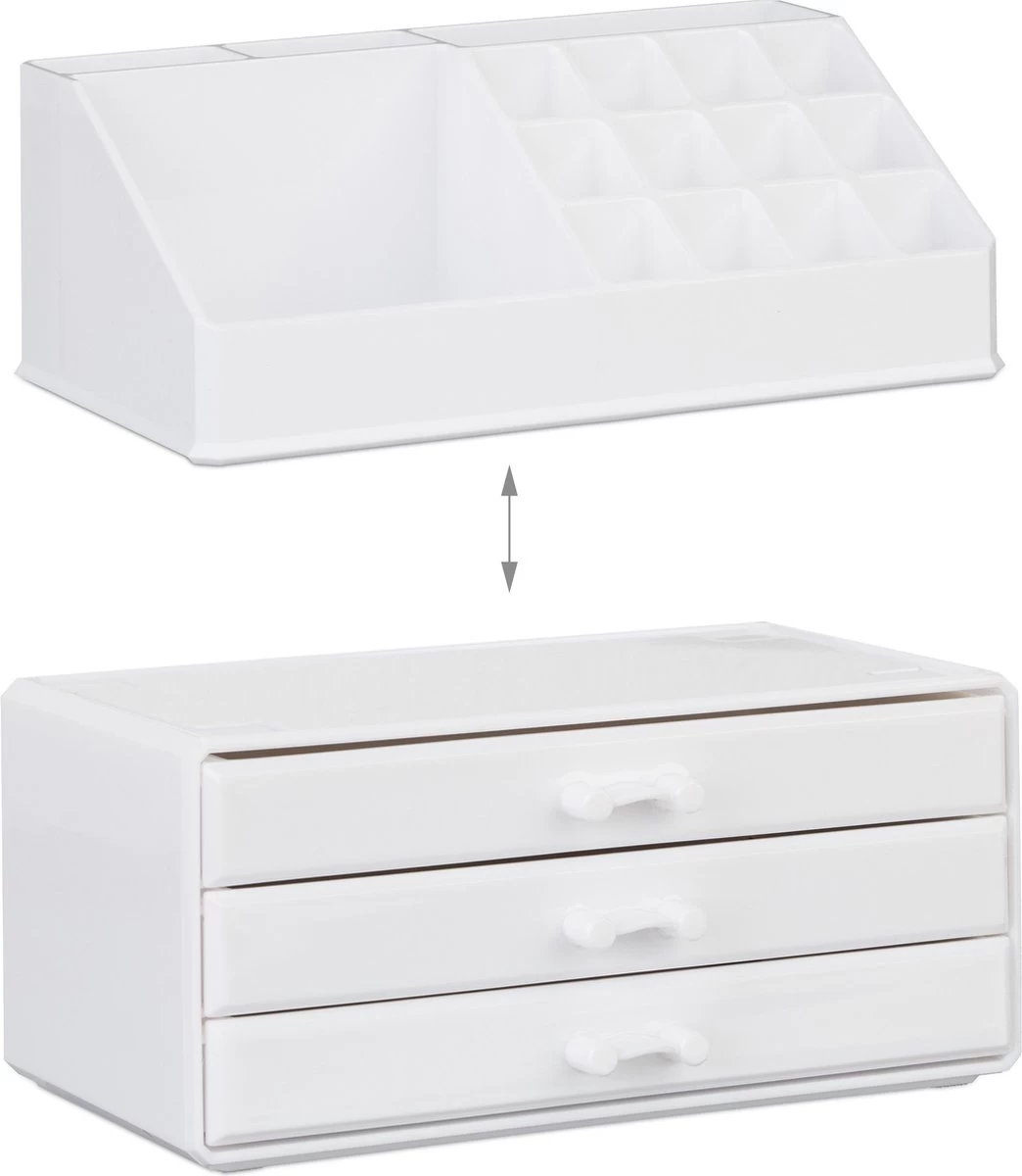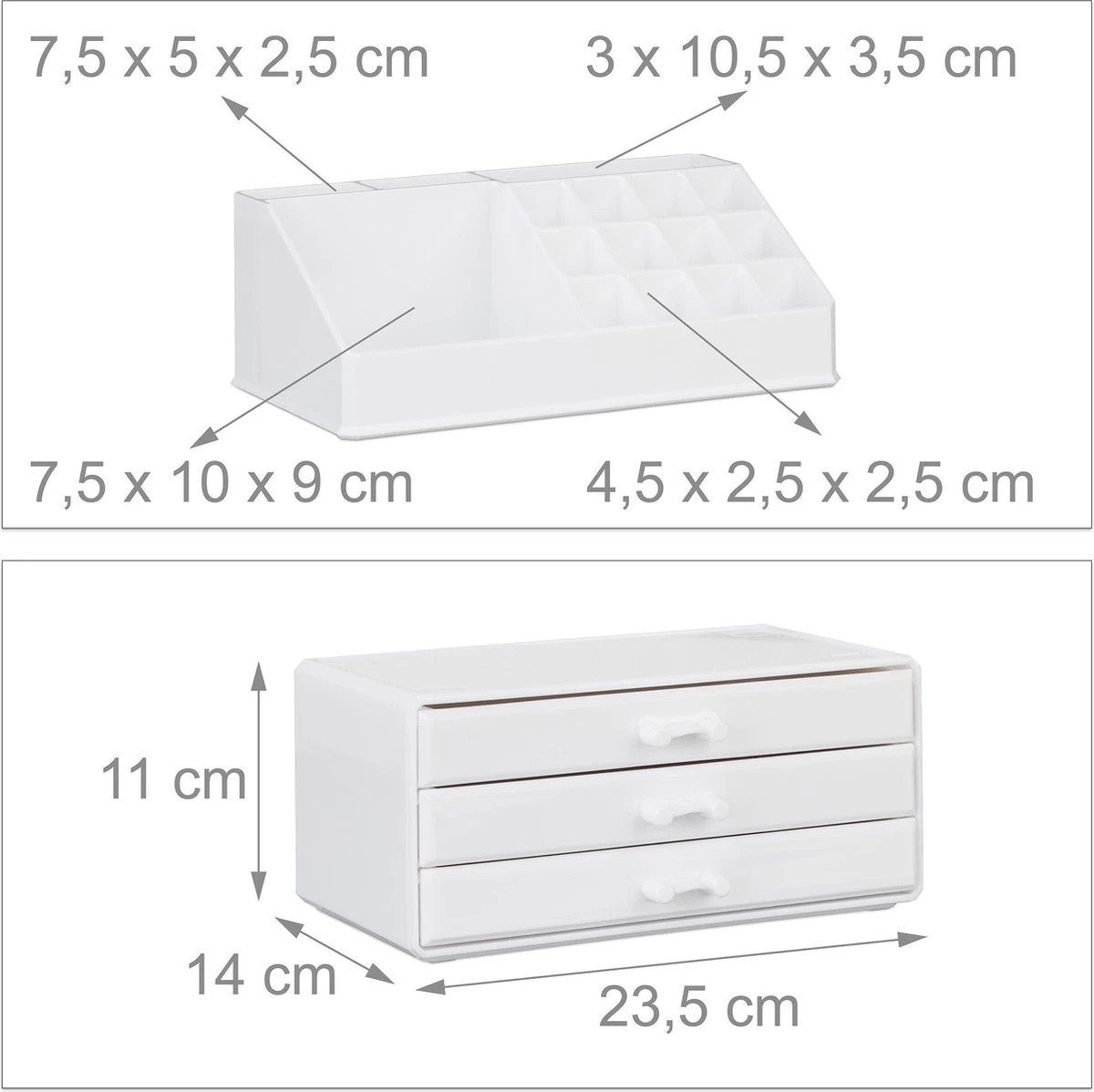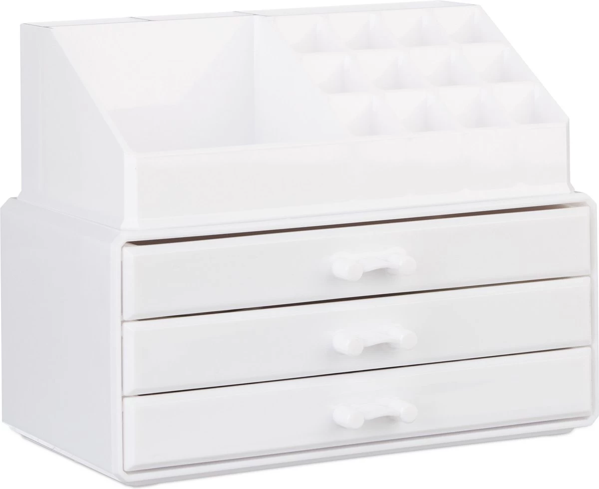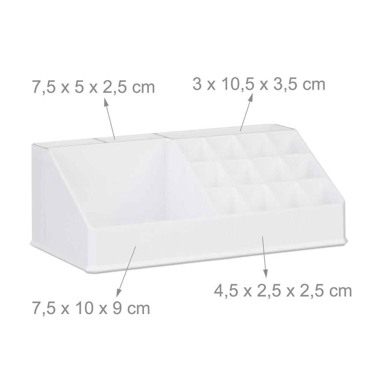 De kleine make-up organizer creëert ruimte op de kaptafel en bespaart je het zoeken in je toilettas. De tweedelige make-up standaard biedt met in totaal 19 vakjes veel opslagruimte voor cosmetica en sieraden. De lades zijn geschikt voor crèmes, poeder en oogschaduw, alsook voor horloges, kettingen en armbanden. De praktische houder voor lippenstift is ook geschikt voor nagellak, borstels, stiften en nog veel meer. De houder doet het ook zeker goed als bureau-organizer voor kantoorartikelen of als opbergruimte voor schroeven en ander klein gereedschap.