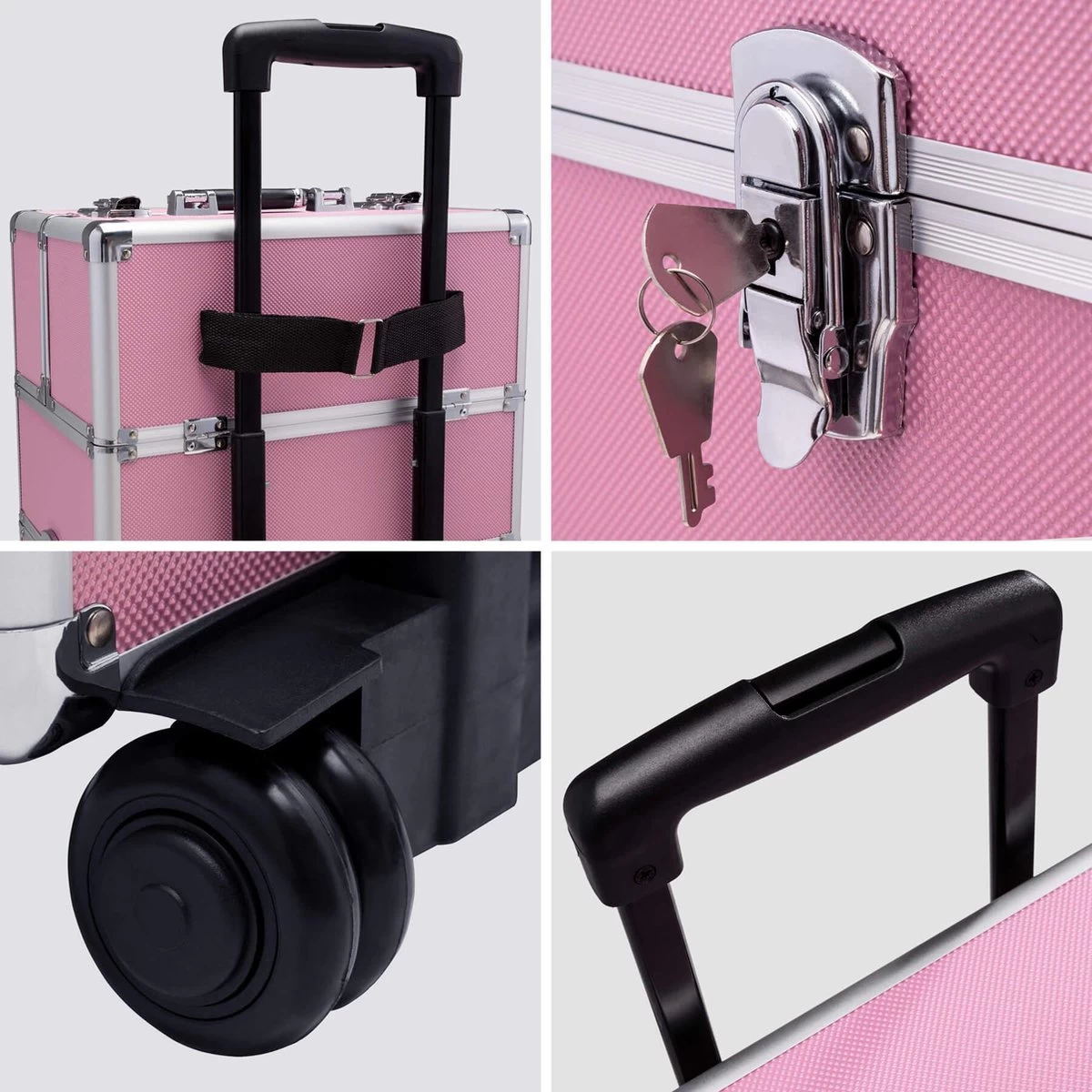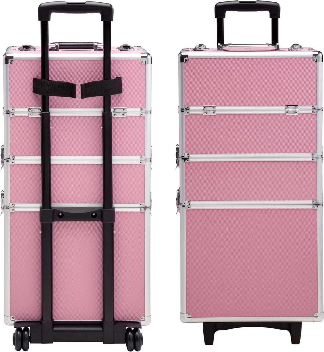 Nooit meer zonder onderweg: Voor make-up, naaigereedschap of andere reisbenodigdheden – de praktische en mooi gevormde cosmeticatrolley van TecTake biedt voldoende ruimte en optimale bescherming voor al uw producten. De koffer bestaat uit 3 met fluweel beklede niveaus die naar believen met elkaar gecombineerd kunnen worden. Het bovenste gedeelte kan individueel als handbagage gebruikt worden. Alle niveaus zijn apart afsluitbaar. De intrekbare handgreep van de combikoffer kan perfect op de verschillende hoogten ingesteld worden. De lichtlopende skaterwielen en de met metaal verstevigde hoeken geven de beautycase maximale mobiliteit en veiligheid. Praktisch, licht en chique: de cosmeticatrolley van TecTake is een trouwe metgezel bij alle toepassingen.
