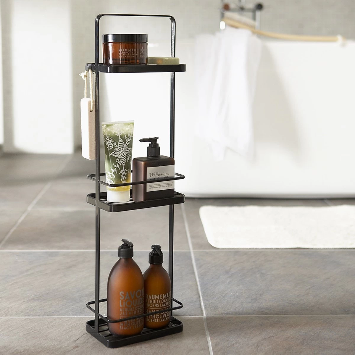 Dit badkamerrek in de kleur zwart is een metalen stellage met drie plankjes. Het is ideaal voor het opbergen van kleine toiletspullen en verzorgingsproducten.