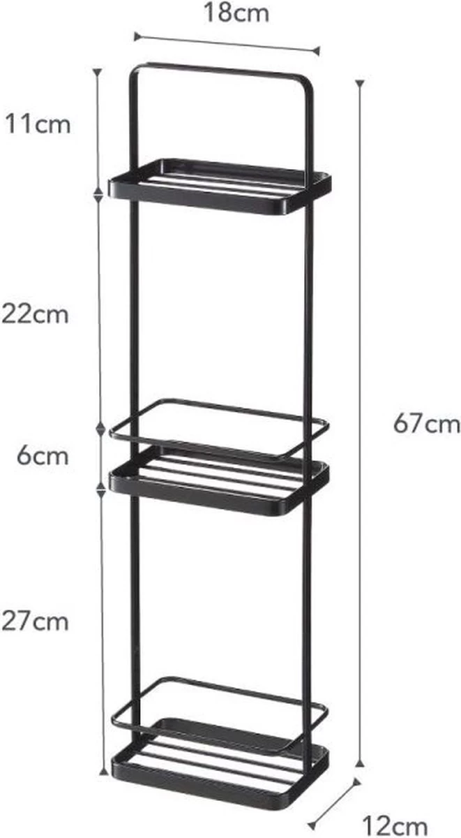 Dit badkamerrek is gemaakt van metaal en heeft een zwarte poedercoating. De stellage heeft drie kleine plankjes. De afmetingen van dit zwart badkamerrek zijn 18 cm breed, 12 cm diep en 67 cm hoog.